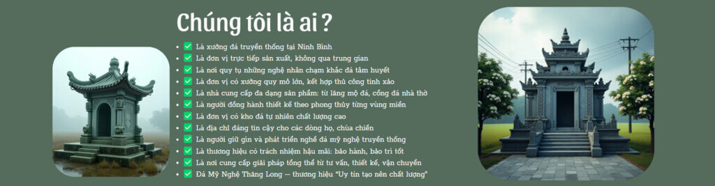 Đá Mỹ Nghệ Thăng Long là một trong những đơn vị uy tín hàng đầu chuyên chế tác và thi công lăng mộ đá, đồ thờ đá tại làng nghề đá Ninh Vân – Ninh Bình.